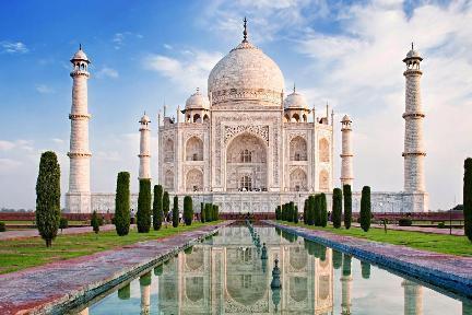 Deslumbrante y casi irreal: el mausoleo de mármol blanco al fondo de un jardín, flanqueado por dos edificios con motivos florales multicolores. Una obra grandiosa para un trágico amor.