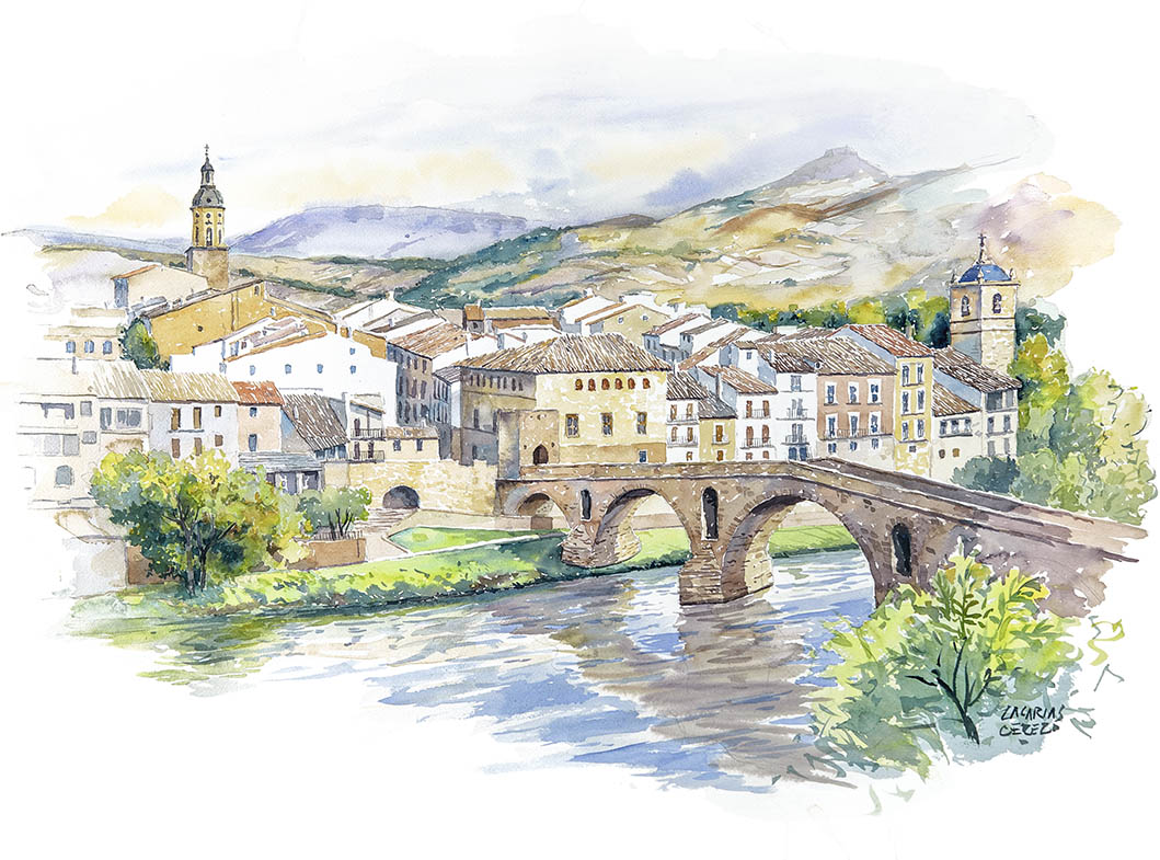 En nuestra Acuarela de viaje dedicada al Camino de Santiago, Zacarías Cerezo ha logrado trasladar, desde la rauda composición que permite esta, para mí, tan difícil técnica de la acuarela, el alma imperecedera de la ruta. Lo ha conseguido tanto a través de la estática de sus monumentos, en la solidez del gran edificio y la humildad de la arquitectura popular, como en la dinámica de los paisajes con figurantes del presente, unos protagonistas que somos, ni más ni menos, que nosotros mismos, los peregrinos.