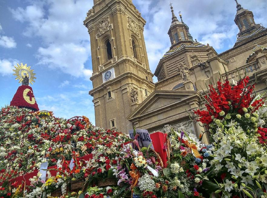 Pero el acto culminante de la celebración es, sin duda, la ofrenda de flores, que congrega a una abigarrada y colorista multitud. Centenares de personas ataviadas con el traje típico aragonés acuden desde todos los lugares de la ciudad para entregar ramos de flores a la Virgen y componer ese gran retablo de aromas y colores. Y todo aquel que quiera participar en la ofrenda, aunque no sea aragonés, puede hacerlo siempre que vaya ataviado con el traje típico de cualquier nación o comunidad autónoma, previa inscripción en el ayuntamiento.